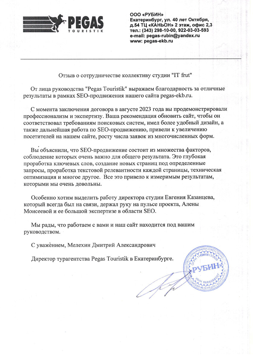 От лица руководства "Pegas Touristik" выражаем благодарность за отличные результаты в рамках SEO-продвижения нашего сайта pegas-ekb.ru.