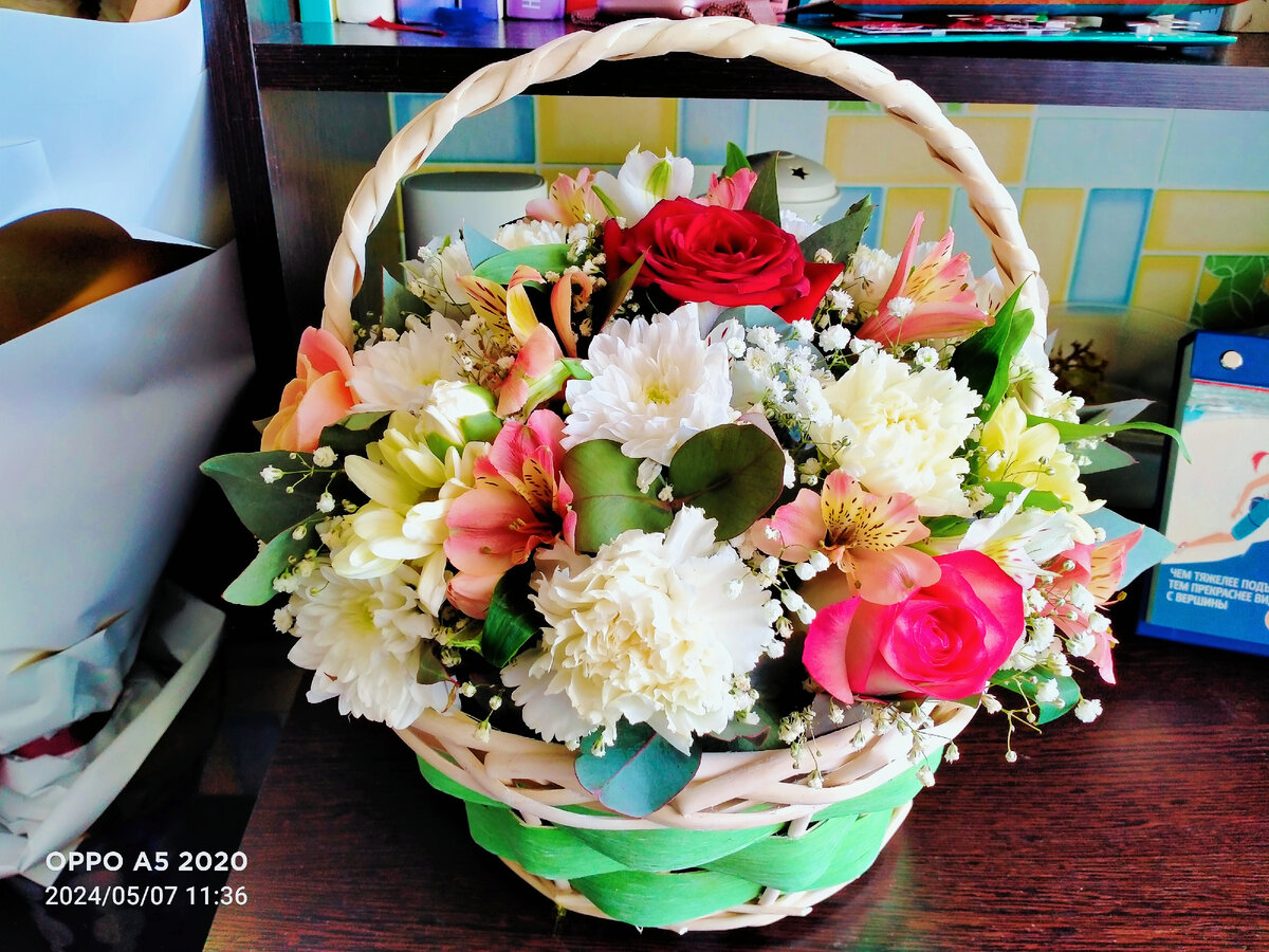 В обед неожиданно папа привез цветы в корзинке. От всех, и бабушки, и родителей.