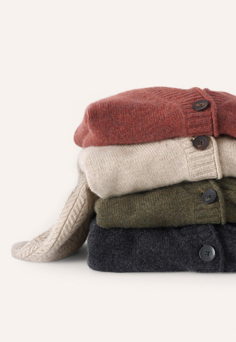 Кашемировый свитер без рукавов, роскошный и универсальный. Оно связано из нашей немного более тяжелой двухслойной пряжи, застегивается на пару настоящих роговых пуговиц и имеет глубокий низ с шевронной строчкой.