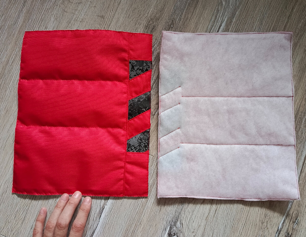 Шью старшему сыну жилетку и решила её простегать. Карманы было решено сделать накладными, как делала в жилетке для среднего сына: Только захотелось мне, чтобы карманы не выбивались из общей картины стежки, поэтому сделала так: Сначала собрала лицевую часть: вход в карман я решила выделить, поэтому к карману была пришита полоска со СВО вставками. Припуск был отложен на большую деталь и отстрочен. Далее на карман мелком были нанесены линии стежки, по которым я простегала карман с утеплителем. Затем нужно было подготовить подкладку: приложила верхнюю деталь кармана к отрезу каризмы и вырезала деталь подкладки. С одной стороны пришила к нему полоски основной ткани - это будет подзор кармана. Припуск отстрочила на деталь из плащевки. Далее сложила детали кармана и его подкладки лицом к лицу и соединила их на машинке. Припуск отложила на подкладку кармана. Теперь складываем карман пополам и фиксируем булавками по периметру. С лицевой стороны прокладываем строчку, фиксируя листочку кармана (п