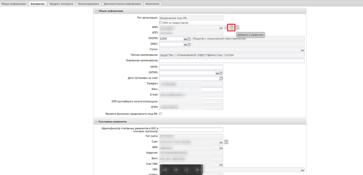На статусе Электронный контракт опубликован в ЕИС после заполнения ОКОПФ и ОКАТО на вкладке контрагент и применения информации требуется нажать на кнопку "Добавить в справочник". Далее после сохранения перейти на вкладку Финансирование нажать на кнопку "Перейти в справочник" нажать на кнопку "Выбрать" и данные из справочника подтянутся, в том числе ОКОПФ. Добавить информацию в справочник потребуется единожды, далее вся информация будет тянуться из справочника.