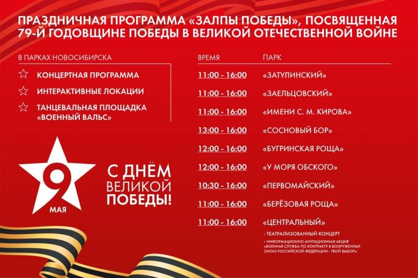Приближается 79-я годовщина Победы в Великой Отечественной войне. Рассказываем, какие праздничные мероприятия пройдут в Новосибирске. 8 мая в 22:00 — ежегодная акция «Свеча памяти». На мемориалах в разных районах Новосибирска горожане зажгут свечи в память о погибших в Великой Отечественной войне. Мероприятия 9 Мая: 9:15 — церемония возложения цветов к бюсту маршала авиации А. И. Покрышкина; 10:00 — начало военного парада на площади Ленина; 10:45 — торжественный вынос знамён — курсанты вынесут большую копию Знамени Победы, знамёна сибирских дивизий, союзных республик, флаг СССР и флаг Победы. Завершающим станет вынос знамени «Новосибирск — Город трудовой доблести»; 10:30–16:00 — праздничные программы в парках Новосибирска; Фото: мэрия Новосибирска 11:00 — сплав-парад на сапах по Оби вдоль всего Новосибирска. Старт от улицы Владимира Заровного, корпус 1; 12:00 — возложение венков к Вечному огню на Монументе Славы; 12:00 — концертная программа в театре «Старый дом», посвящённая Победе в