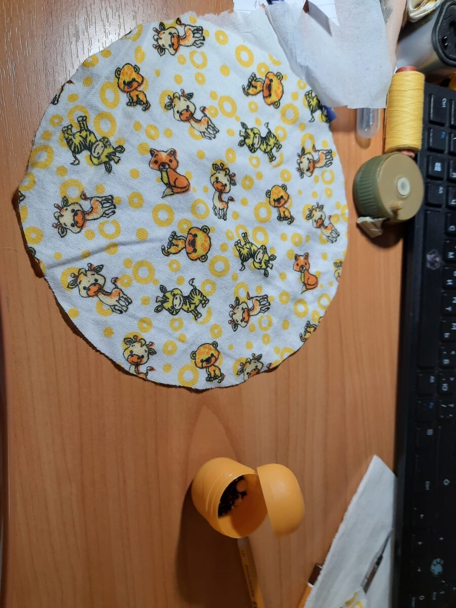 У всех должны быть свои игрушки, даже у реборнов. Поэтому Катя намекнула мне, что она тоже хочет свою какую-нибудь игрушку. А какие игрушки бывают у младенцев (пусть и игрушечных)? Точно, погремушки! Вот так возникла эта идея. Но...долго делать как-то не хочется,ведь еще очень много дел, поэтому придумать бы что-то попроще. Так... Погремушка должна греметь - ведь именно в этом ее смысл! Что бы такое взять? О, точно! Капсула от Киндера идеально подойдет! Ну что ж, основу выбрали - теперь можно и творчеством заняться. Для начала выберем подходящую ткань - я выбрала желтую фланель с жирафиками (так как Катя любит желтый и розовый, но делать погремушку под цвет бодика не интересно) и вырезаем достаточно большой круг, так, чтобы он закрывал основу и оставался хвост. Я для этого использовала мамину настольную лампу😄 Теперь берем нашу основу, и насыпаем в нее что-нибудь, что будет греметь. Можно для этого использовать крупы. Я насыпала все, что попалось под руку😄 - горох, рис, гречку, пш