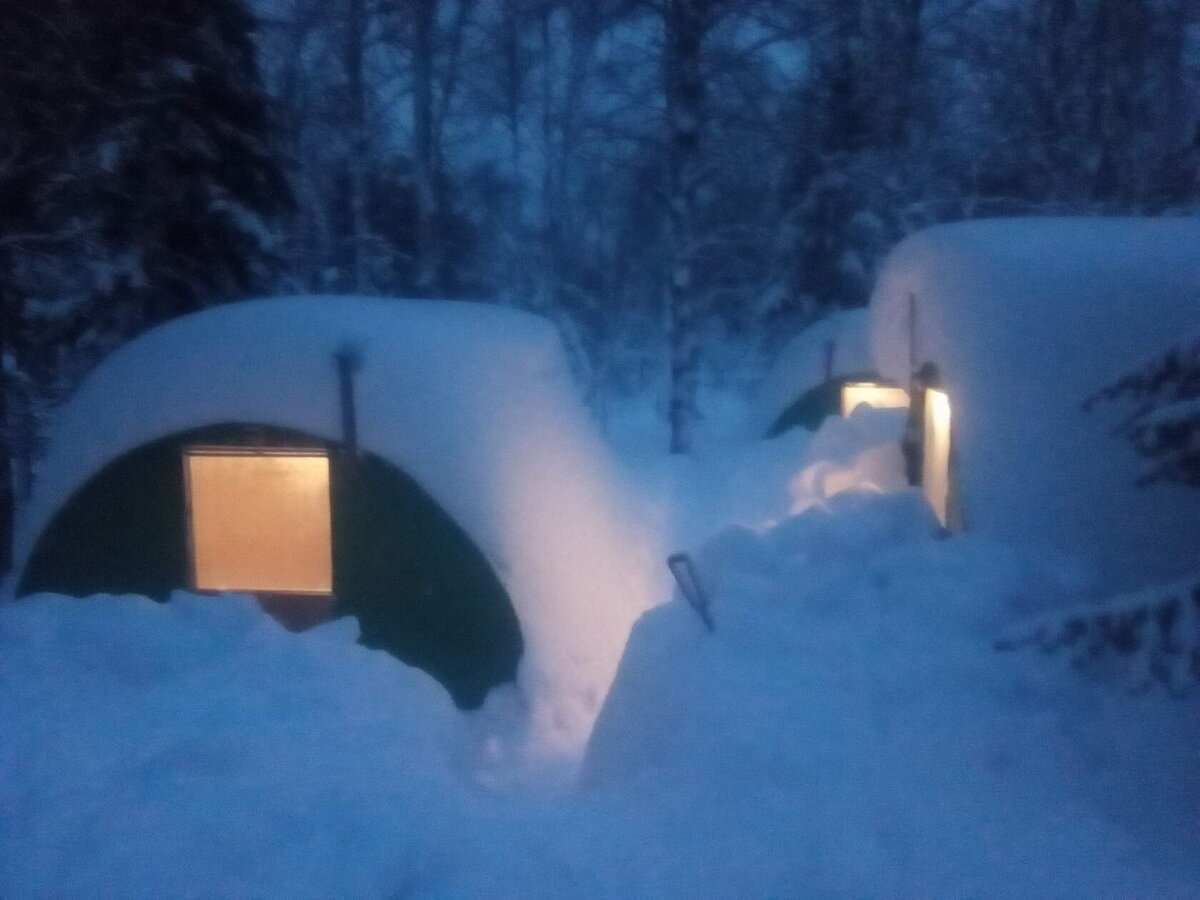 Первый долгоиграющий лагерь был из из 3-х палаток Куб-3 (две индивидуальных домика и кухня) и одной Куб-2 (моя палатка, без понтов, всё, что необходимо и достаточно). Всё это хозяйство обогревались и освещалось электростанцией на 5,5 кВт. За сутки сжигалось около 60-80 литров бензина. Но от этого лагеря, в удобном, спокойном месте, с доступом к воде было далековато до хребта, а световой день зимой короткий. Поэтому было принято решение о строительстве лагеря в горах. Были завезены стройматериалы и построен горный лагерь. Утепление по кругу 100 мм. Построено 2:домика 2х3 метра, Отопление 750/1500 Вт, после прогрева 750 Вт. Один домик 4х3 метра. Из них 2х3 кухня-столовая, 2х3 спальня. Отопление 900/1800 Вт. После прогрева 900 Вт. Всё домики оборудованы вытяжной вентиляцией. Лагерь замечательно отработал зиму, расход топлива не превышал 50 литров в сутки. Сделали много замечательных съёмок, доехали по хребту в ранее не доступные места. Летом и осенью лагерь доставлял только положитель
