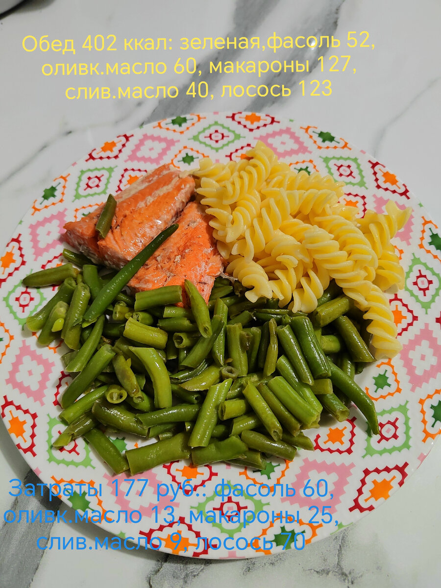 Сегодня на обед дикий лосось 100 гр, безглютеновые макароны 35 гр, масло сливочное 5 гр, масло оливковое полстоловой ложки, зелёная фасоль 200 гр.