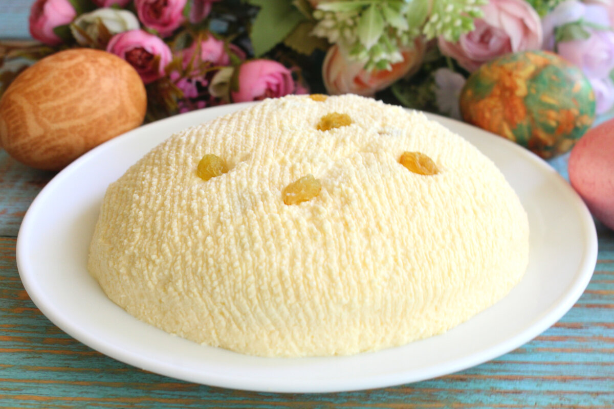 Продолжаются праздники, идет Светлая Седмица. Побалуем себя вкусным. Готовила пасху по новому рецепту и это самая нежная пасха, которую я пробовала. Получается великолепный сливочный десерт, он даже слегка напоминает мороженое. Такая сочная, мягкая, сладкая и вкусная пасха понравится взрослым, а дети будут в восторге от этого лакомства. Да, это калорийное блюдо, но кусочек пасхи в праздничные дни съесть не возбраняется. Наполнение пасхи всегда можно выбрать по своему вкусу: курага, изюм, сухофрукты, цукаты, вяленые ягоды. Я добавляю в пасху светлый изюм. Можно совершенно ничего не добавлять и будет вкусно. Ингредиенты: Молоко - 2 л. Сметана 20% - 500 г. Яйцо куриное - 5 шт. Сахар - 200 г. Сливочное масло - 200 г. Сахар ванильный - 10 г. Соль - щепотка Изюм светлый - 100 г. Смешиваем сметану с яйцами, хорошо взбиваем вилкой или недолго миксером. Молоко вливаем в кастрюлю, ставим посуду на огонь, доводим почти до кипения и вливаем яичную массу. Постоянно помешиваем и снова доводим массу