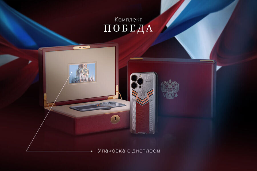 ПОДПИСЫВАЙТЕСЬ НА КАНАЛ Компания Caviar выпустила эксклюзивную модель iPhone 15 Pro. Его цена начинается от 519 тысяч рублей. Об этом 7 мая сообщает официальный производитель телефона. СМОТРЕТЬ ВИДЕО Всё бы ничего, и, наверное, можно было бы порадоваться за отечественных производителей, если бы не два «но». Выпуск приурочен к празднованию 9 Мая в России, и сама модель носит название «Победа». С великим событием в истории нашего государства связан дизайн телефона и упаковки. ПОДПИСЫВАЙТЕСЬ НА КАНАЛ К айфону, украшенному ювелирной эмалью в цветах Георгиевской ленты, барельефом пятиконечной звезды из авиационного титана и панно из телячьей кожи красного цвета, прилагается футляр. Его главная особенность - встроенный дисплей. Когда коробка открывается, на экране мини-телевизора воспроизводится запись патриотических торжеств в честь Дня Победы и звучит легендарная песня «День Победы» - о празднике со слезами на глазах. Надеемся, это не намёк на пролитые из-за полум