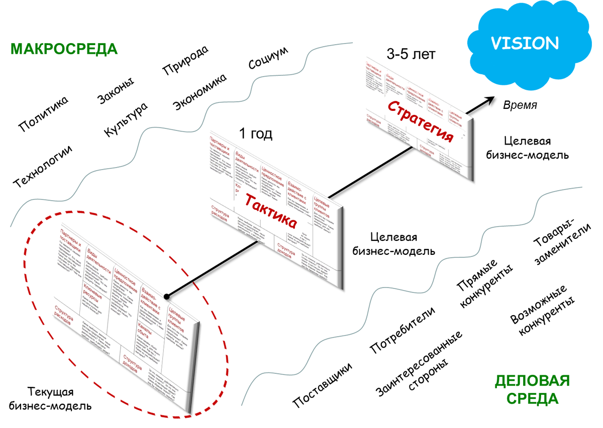 Один из важнейших этапов в технологии целевого управления KPI-Pro – это разработка бизнес-модели и стратегии компании. Практически в результате данного этапа мы заполняем новый шаблон бизнес-модели Canvas+. После того, как мы выбрали способ развития бизнес-модели (оптимизация или трансформация или их сочетание) мы можем построить целевую бизнес-модель компании. Это ваша «точка Б». При этом обычно планируются как стратегические (на 3-5 лет), так и тактические (на 1 год) изменения в бизнес-модели. Эти изменения могут происходить во всех блоках шаблона. Какие-то элементы текущей бизнес-модели мы можем оставить без изменений, усилить или ослабить, исключить или добавить новые. Причем, изменения в одном из блоков могут «потянуть» за собой неизбежные изменения в других блоках. Например, появление новой группы клиентов может привести к изменениям в ценностном предложении, а также каналах продаж и взаимодействия с клиентами и т.д. Поэтому при исключении старых или добавлении новых элементов ва