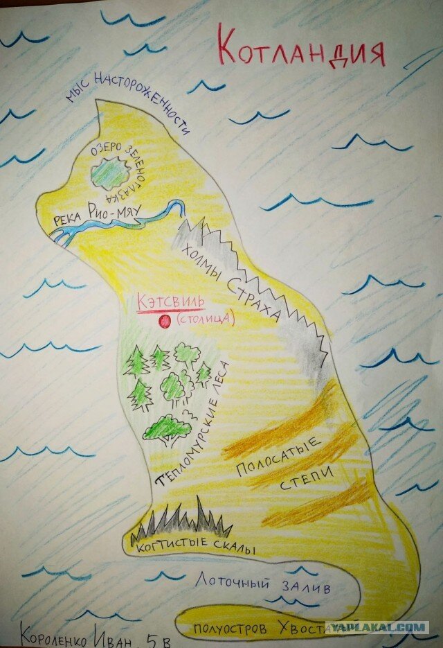 Не буду голословен и приведу пример. Недавно увидел в сети такой рисунок. Авторам его нельзя отказать в креативности. Если не знать, что это не просто рисунок, а - карта. И не просто карта, а нарисованная в качестве домашнего задания для урока истории. Да, да. Современных школьников, которые начинают учить историю в 5 классе на одном из первых уроков просят придумать и нарисовать карту выдуманной страны. Спрашивается, зачем? Я был всегда уверен в том, что история - это наука. И изучени