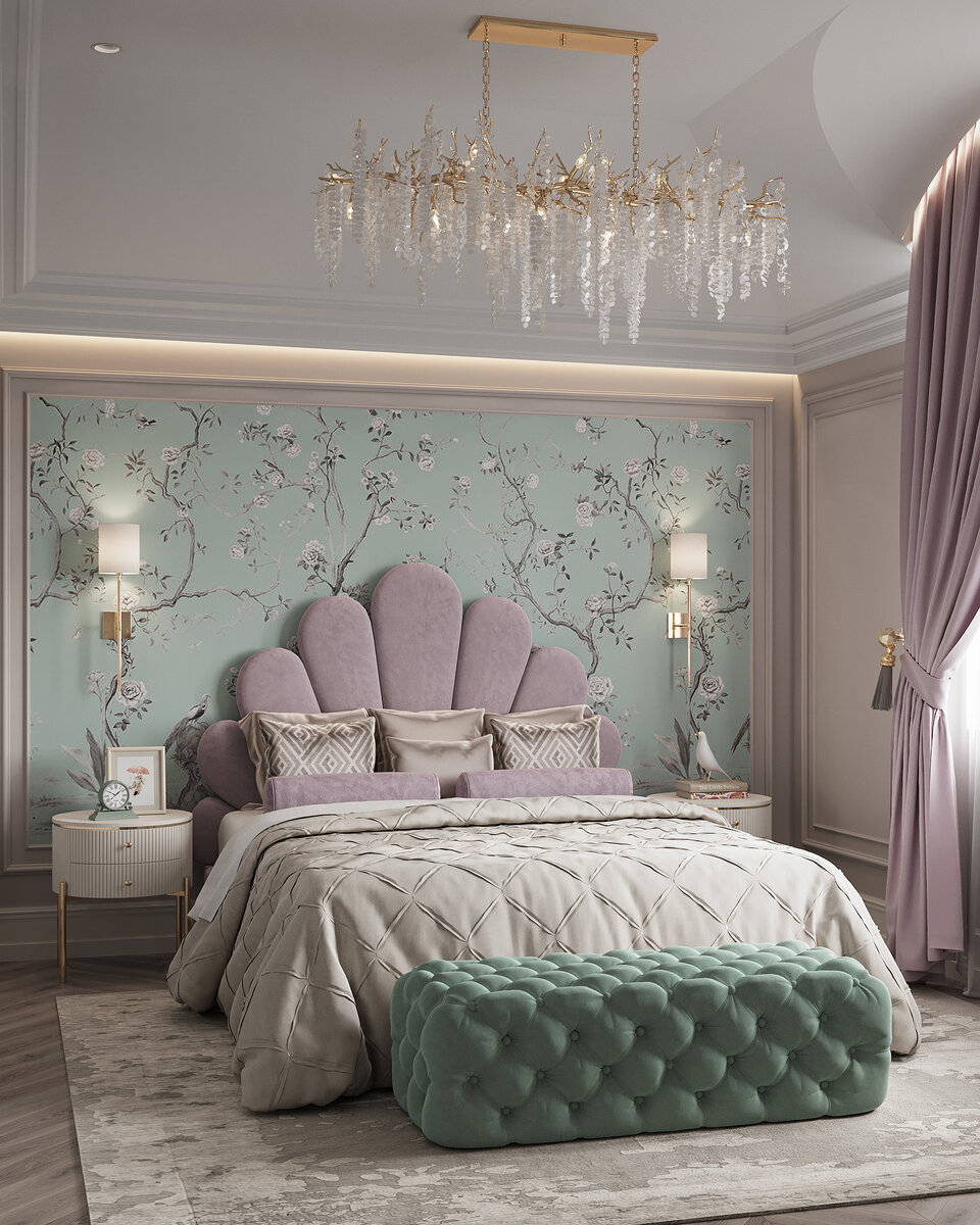 За окном теплая солнечная погода и приятное пение птиц☀️ Делюсь с вами красотой и эстетикой наших весенних интерьеров🤍 Романтичная спальня в мятных пыльно-розовых тонах Такая цветовая гамма добавит нежности и легкости в интерьер, а округлые формы мебели придадут комнате мягкость и уют. Флористические мотивы обоев с ручной росписью украшают стену этой спальни, так же эти мотивы прослеживаются в оригинальной люстре над кроватью, создавая неповторимую атмосферу романтики. Остальные стены комнаты оформлены в сдержанных пастельных тонах, а мебель в нежных оттенках айвори.