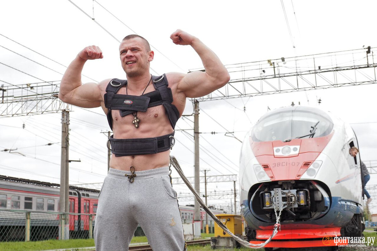 В Петербурге силач Денис Вовк вручную отбуксировал «Сапсан» весом 650 тонн Атлет Федерации силового экстрима России Денис Вовк смог вручную сдвинуть состав «Сапсана» весом 650 тонн в честь 15-летия с момента запуска высокоскоростного поезда по маршруту Москва — Санкт-Петербург. Необычное действие происходило 7 мая в петербургском депо «Металлострой». Вовк совершил две попытки. С первого раза он сдвинул поезд примерно на полметра. Со второй попытки ему удалось совершить рывок на 1 м 48 см всего за 37 секунд. Ручную буксировку снимали на видео с нескольких камер в присутствии экспертов по силовому экстриму. Как сообщили организаторы, все материалы будут направлены в Книгу рекордов Гиннесса для фиксации достижения. В разговоре с журналистами Вовк пообещал на День ВМФ сдвинуть подводную лодку. Денис Вовк — один из сильнейших людей России в дисциплине «Силовой экстрим» в категории до 90 кг, обладатель двух мировых рекордов, занесенных в Книгу рекордов Гиннесса. Трек-пул — одно из самых попу