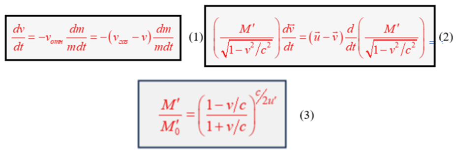 Но именно на основе неверного дифференциального уравнения (1) и было в свое время Я. Аккеретом (Aekeret J.) и Е. Зенгером (Sanger E.). построено широко известное так называемое обобщенное релятивистское дифференциальное уравнение (2). Получено оно было ими простой подстановкой так называемых «релятивистских масс» в предыдущее, приведенное нами неверное дифференциальное уравнение (1). Поэтому уравнение (2) также неверно, и потому оно не может являться тем уравнением, которым его объявляют. А именно оно не может являться обобщенным релятивистским дифференциальным уравнением реактивного движения для межзвездного пространства.