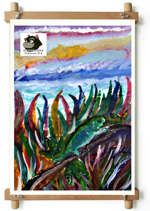 Начинаем работу с лёгкого построения композиции. Рисуем ветку и хамелеона на ней, намечаем линию горизонта. Пейзаж будет с лёгким рельефным изображением главного героя и ветки дерева. Выполняем их в пластилине, примазываем к листу бумаги по контурам маленькие кусочки пластилина. Затем работаем с зубной пастой. Обезжириваем пластилиновые части композиции, покрываем их белой зубной пастой и оставляем сохнуть. Двухцветной зубной пастой рисуем море(пальчиками, волнообразные линии) на заднем плане работы. Далее работаем гуашью, создаём фон неба. Используем синею, голубую и белую гуашь-мазки делаем небольшого размера в горизонтальном направлении. Затем с помощью красной гуаши способом примакивания рисуем очертания облаков. Затем вводим жёлтый цвет-создаё