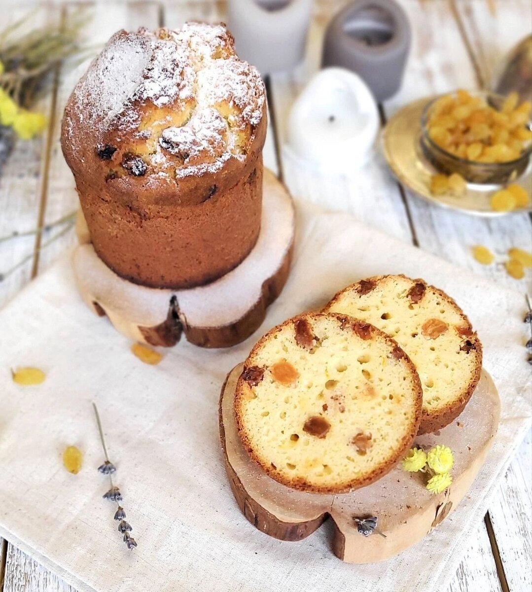 Рецепт творожного кулича без дрожжей. Автор Катя Багрова: Лучше поздно, чем никогда. Рецепт этих куличей вам обязательно пригодится) Для приготовления двух куличей (формы: диаметром 9 см и 11 см) вам понадобятся следующие ингредиенты: - 200 г сливочного масла - 4 яйца - 150 г сахара - 200 г сухого творога (9%) - 100 г кукурузного крахмала - 220 г муки - 10 г разрыхлителя - 150 г изюма + немного муки для обсыпки - 1 чайная ложка экстракта ванили - Цедра 1 апельсина Шаги приготовления: 1. Замочите изюм в воде на 30 минут. После этого слейте лишнюю воду и обсыпьте изюм мукой. 2. Растопите сливочное масло и дайте ему остыть. 3. Взбейте яйца с сахаром до белой пены примерно 10 минут. 4. Добавьте творог (если он крупинистый, протрите его через сито или пробейте блендером), ванильный экстракт, и перемешайте. 5. Влейте остывшее растопленное масло, перемешайте. 6. Добавьте крахмал и цедру апельсина, перемешайте. 7. Постепенно добавляйте муку, предварительно смешанную с разрыхлителем, и