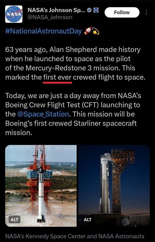 В воскресенье, 5 мая 2024 года, Космический центр NASA имени Линдона Джонсона опубликовал в твиттере (сеть Х) пост об астронавте Алане Шепарде, который 63 года назад совершил полёт в космос. В посте NASA говорится, что Алан Шепард вошел в историю, отправившись в космос в качестве пилота миссии «Меркурий-Редстоун-3». А далее американское агентство добавило, что «это был первый в истории пилотируемый полет в космос» - "This marked the first ever crewed flight to space".