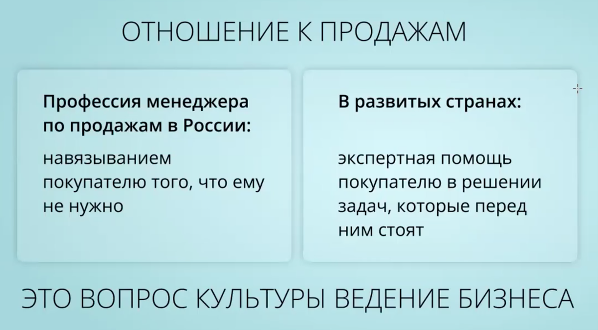 Отношение к продажам в нашей стране очень специфическое и берет свои корни с конца 80-х, начала 90-х годов. Тогда считалось, что продавец - это спекулянт, барыга, цель которого обманом продать ненужную вещь беззащитным покупателям. То есть продавец - нечестная профессия. Тогда как зарубежом работа продавца - это квалифицированный труд, цель которого - экспертно помогать покупателю принимать решения из позиции лучшего способа удовлетворения его запроса. Продавец решает ПРОБЛЕМУ покупателя, получая за это ЗАСЛУЖЕННОЕ вознаграждение. Да и вообще, к финансисту, у которого на почетном месте в его кабинете висит диплом курса "Как дорого продавать свои услуги", вряд ли захочется обращаться. Ведь ценят аналитика и финансиста не за способность продавать, а за способность решить проблему в бизнесе.