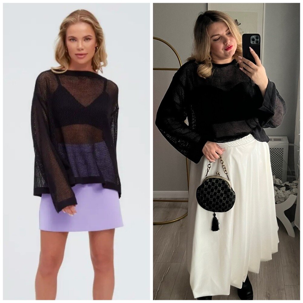 Здравствуйте, дорогие читатели! Меня зовут Марина, я - стилист PLUS SIZE, и на этом канале показываю одежду и аксессуары с Wildberries такими, как они есть, то есть, из серии "ожидание/реальность". Мои параметры: рост 170 см, вес 95 кг, 110-92-118 ✅Основной канал: Стилист PLUS SIZE Ставьте лайк в поддержку канала, и давайте смотреть на мою сегодняшнюю покупку. Сетка - это очень классный и стильный элемент, который добавит образу изюминку, сейчас такие вещи в тренде, кроме того, на лето они очень функциональны. Джемпер, как на мне, можно носить поверх разных топов или даже закрытого нижнего белья, тут кому как удобнее. Он представлен в 6 цветах на ВБ, я выбрала базовый черный, который подходит ко всему. Можно носить как на повседневной основе, так и в отпуске или на вечер. Джемпер укороченный, разумеется, оверсайз, но не сидит мешком. Размеры единые, два на выбор: 44-52 и 54-60. Если вам нужен артикул джемпера, ставьте + в комментарии, всем отвечу. Ставим вердикт джемперу: ДА или НЕТ?⬇️