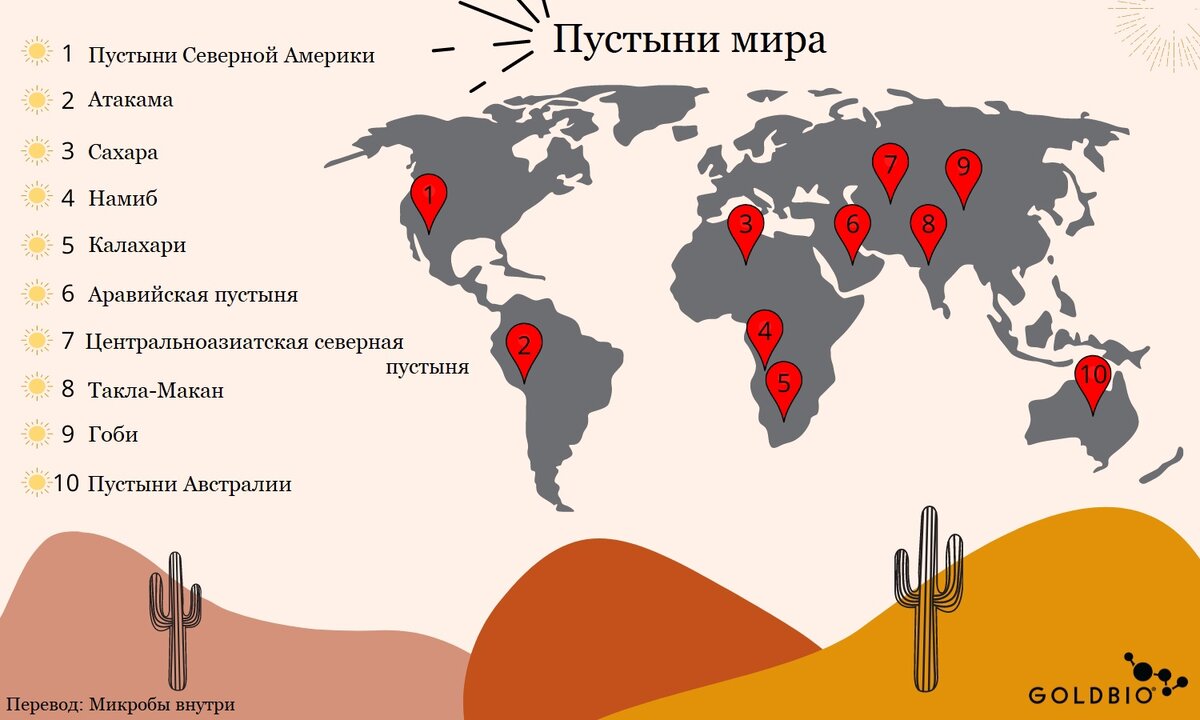 У каждой пустыни свои суточные изменения температуры, влажности и кислотности. Однако, для всех характерно низкое содержание питательных веществ, высокая концентрация солей и сильное солнечное и ветровое воздействия. Таким образом, пустынные экосистемы различаются по своим особенностям, несмотря на поверхностное сходство. Пустынные почвы всего мира обычно содержат множество распространенных фил, включая Actinobacteria, Bacteroidetes и Proteobacteria. В пустыне Сахара доминирующими филами были бактериальные сообщества Proteobacteria, Actinobacteria и Firmicutes. А вот в Атакама изучались в основном микробы живущие на корнях растений - ризосферные микробы.