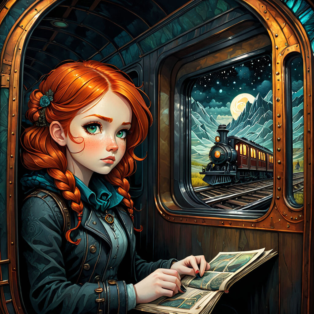 лучшее качество, живопись тушью, акрил, депрессивное искусство, рыжеволосая девушка в поезде в ад, детальное лицо, автор Craola, Dan Mumford, Andy Kehoe, 2d, плоский, милый, очаровательный, винтаж, искусство на потрескавшейся бумаге, сказка, пэчворк, витраж, сборник рассказов, детальная иллюстрация, кинематографический, сверхвысокая детализация, мелкие детали, красивые детали, мистический, люминисцентный, яркие цвета, сложный фон