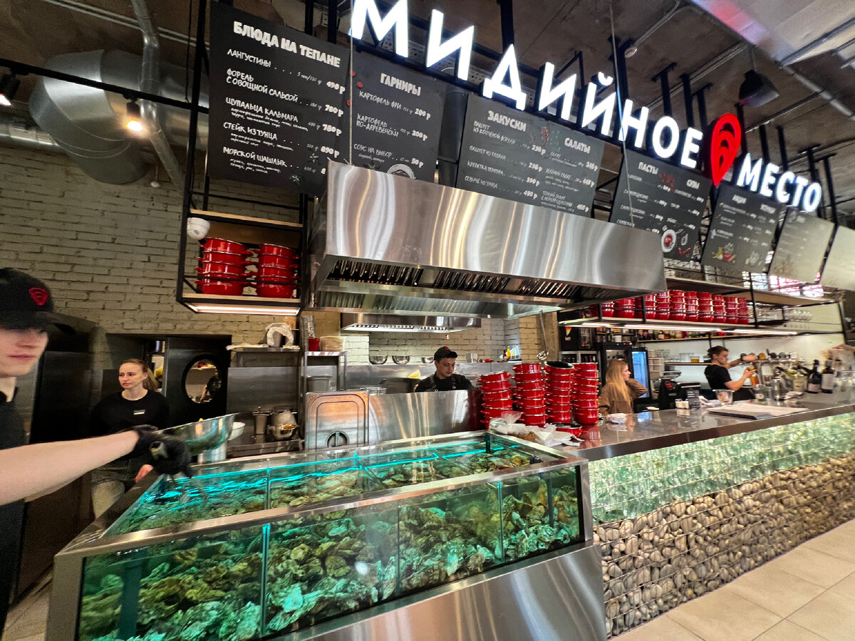 В какой город не приеду - везде вижу вывеску этого ресторана (нет, это не приевшийся фастфуд). Настолько часто встречалось нам "Мидийное место" на пути, что, споткнувшись о него в очередной раз глазами на карте города, решили: - Да идем же уже наконец! Питер, Москва, Сочи, Крым, Рязань, Тула... Можно перечислять и дальше. В 27 городах России открыто 40 ресторанов. Раз такой масштаб, это о чем-то говорит :)) Сбылось. Добрались и мы до популярного в России ресторана. Идём смотреть Народищу, ух. Уверен, во всем виновата суббота. Нам еле нашли столик, хотя в зале их полно. Интерьер оформлен в морской тематике. Тут и мидийные контуры на стенах, и рыбацкие сети на потолке. Меню выдают на руки, либо можно подойти к стойке, там на больших экранах тоже все есть. Но в печатном меню - с картинками, так интереснее. Берём его и всё внимательно изучаем. Большинство блюд из морских обитателей: устрицы, мидии, лангустины, рыба. Здесь ГАЛЕРЕЯ и фото меню >>> листайте: Мидии - самое популярное блю
