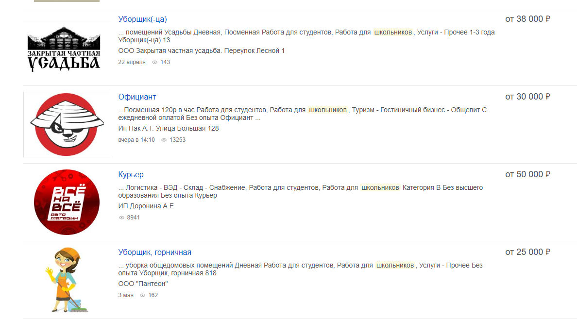 Помимо вакансий, предложенных в центре занятости, можно поискать работу для школьников на специальных площадках в Интернете. Например, на сайте FarPost.ru на время каникул предлагают попробовать себя промоутером, автомойщиком, уборщиком или официантом. Зарплаты от 25 000 рублей.