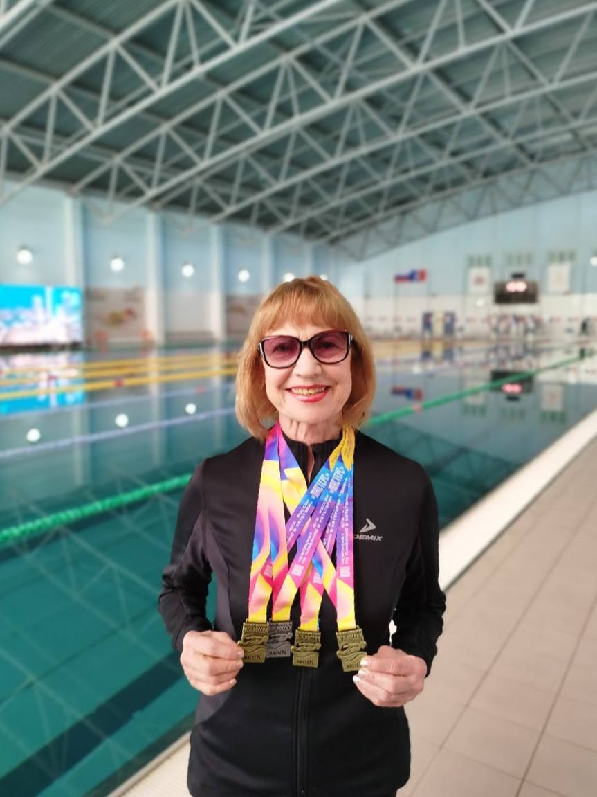 🏅На чемпионате Юга России Тамара Львовна завоевала 3 золотых медали на дистанциях 50 в/с, 100 в/с и 200 в/с и 1 серебряную медаль в заплыве 50 м. баттерфляй.