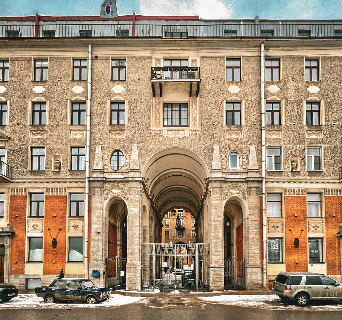 С другой стороны шумной улицы Рубинштейна притаился, смотря на воду, красавец-гигант с арками-лабиринтами в несколько этажей. Это — Толстовский дом.