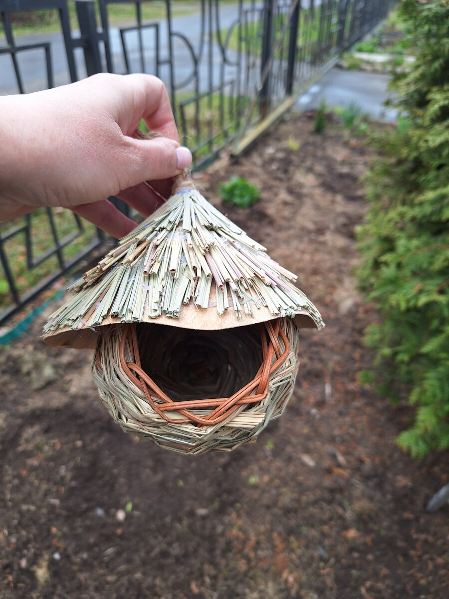 У меня на участке растёт очень большая туя. Посажена она была очень давно и выросла уже в огромное дерево. И вот я заметила, что с юго-восточной стороны туи есть место, где мало веток и дерево образует такую дыру в кроне. Думала я недолго, а именно - быстро. Вот и появилась задумка повесить туда гнездо. Покажу вам его со всех ракурсов. Основание изготовлено из материала, похожего на солому. Крыша из материала, похожего на картон, покрытого всё той же соломой. Диаметр гнезда примерно 20 см. Эта туя излюбленное место у птиц. Они регулярно сидят внутри нее на ветках, но гнезд не вьют, так что получить фатальный для потомства испуг, они не смогут. Конечно, это гнездо - такая шутка, декор. Его видно только с пары точек в саду, но мне приятно знать, что оно там есть. По-моему мило получилось. А главное, как и положено гнезду - оно не выделяется на фоне туи и сроднилось с окружающей средой. Спасибо за лайк, друзья. Все фото мои. Ваша Светлана и Сад в розовых тонах. Ленинградская область