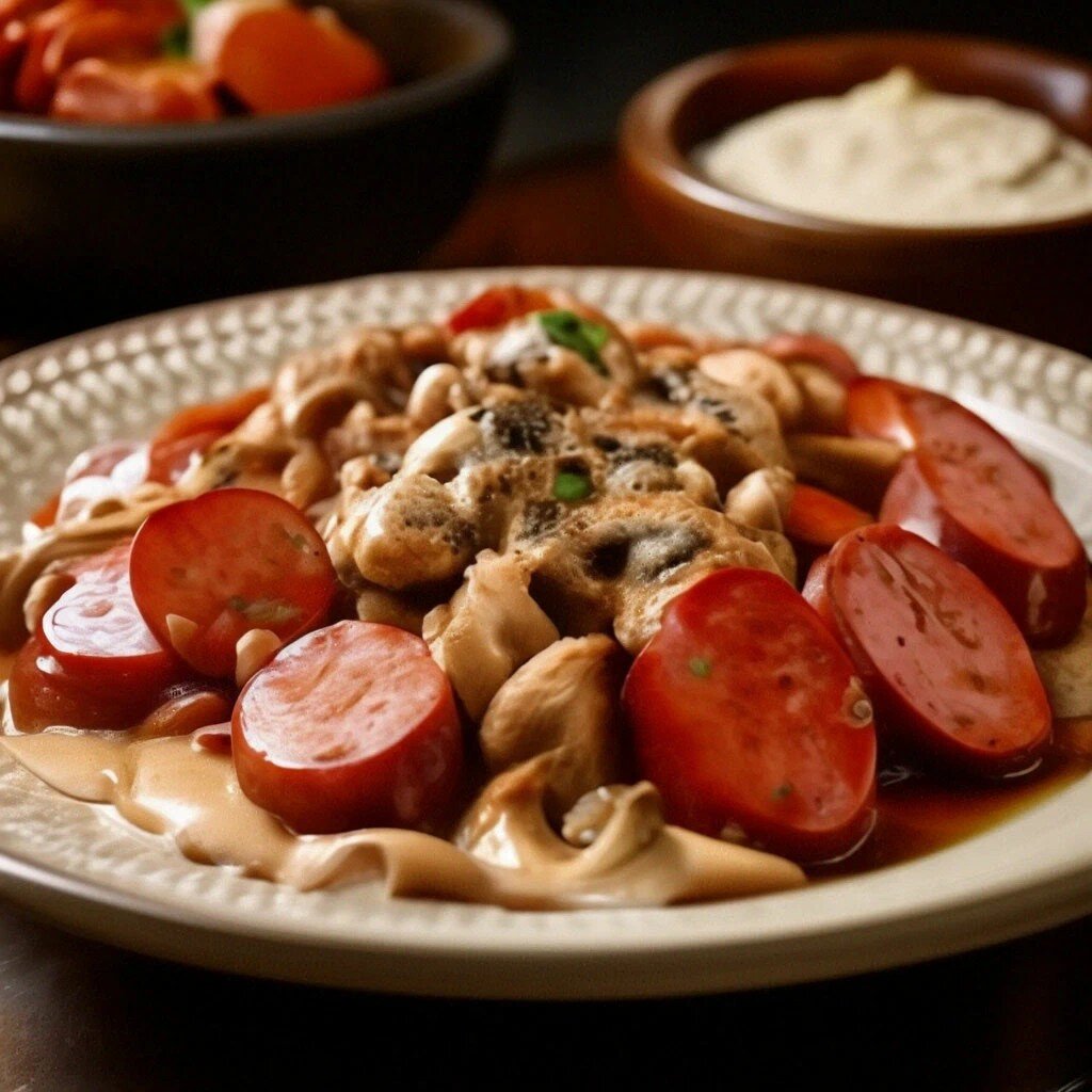 Ингредиенты: - Колбаски (сосиски, сардельки) – 400 г - Шампиньоны – 500 г (можно использовать и другие грибы) - Лук репчатый – 1 шт. - Сметана – 2 ст.л. - Мука – 1 ст.л. с горкой - Растительное масло – 1-2 ст.л. (для жарки) - Соль, перец – по вкусу - Зелень (укроп, петрушка) – по желанию - Чеснок – 3 зубчика (по желанию) Приготовление: 1. Колбаски нарежьте на кусочки. 2. Разогрейте сковороду с растительным маслом, выложите колбаски и обжарьте на среднем огне до золотистой корочки. 3. Лук нарежьте мелкими кубиками. 4. Грибы нарежьте тонкими пластинками. 5. Добавьте лук и грибы в сковороду с колбасками, перемешайте и жарьте на среднем огне, периодически помешивая, пока лук не станет прозрачным. 6. В отдельной миске смешайте сметану, муку и измельченный чеснок (по желанию). 7. Постепенно добавляйте сметанную смесь в сковороду к колбаскам и грибам, постоянно помешивая. Доведите до кипения, убавьте огонь до минимума и тушите под крышкой 10-15 минут. 8. Соус должен загустеть, а ко