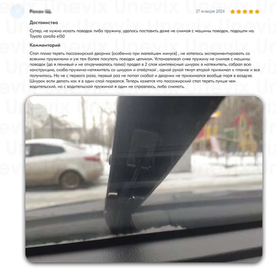 Со временем, пружины в поводках деформируются и растягиваются, из-за чего щётки не плотно прилегают к стеклу. Комплект натяжителей вернет силу прижима и решит проблему раздражающих полос на лобовом стекле.