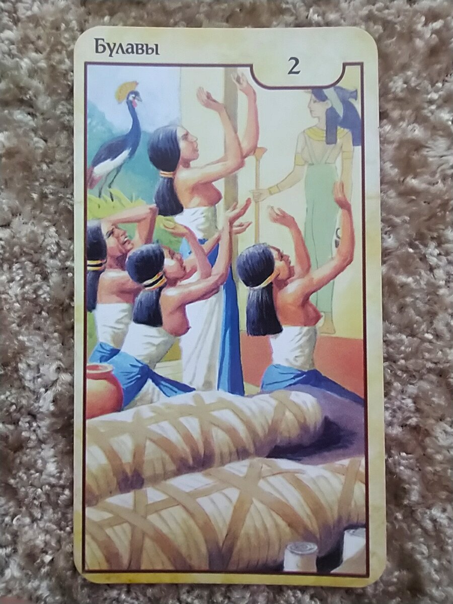 Здравствуйте, дорогие читатели. Сегодня мы рассмотрим следующую карту, чтобы понять основные тенденции этой среды - 8 мая. Перед нами 2 булав. На изображении мы видим два тела, завернутых в саван, и плакальщиц, которые взывают о благосклонности богов к душам усопших. Женщины возносят мольбы богине Маат. А на заднем плане, словно наблюдая за процессией, красуется венценосный журавль. Давайте сперва разберём значение отдельных символов. Что мы знаем о богине Маат? Маат - это Богиня истины, справедливости, гармонии, божественного порядка и равновесия, мудрости и правосудия, законов морали и, регулирующих звёзд, годовых циклов. Журавль в древнеегипетской культуре часто ассоциируется с долголетием, мудростью и благородством. В контексте этой карты венценосный журавль может символизировать высокие идеалы, стремление к высшим знаниям и духовному развитию. Его присутствие на заднем плане подчеркивает тему вечности и бессмертия души. Тела, завернутые в саван, и плакальщицы, молящиеся богине Ма