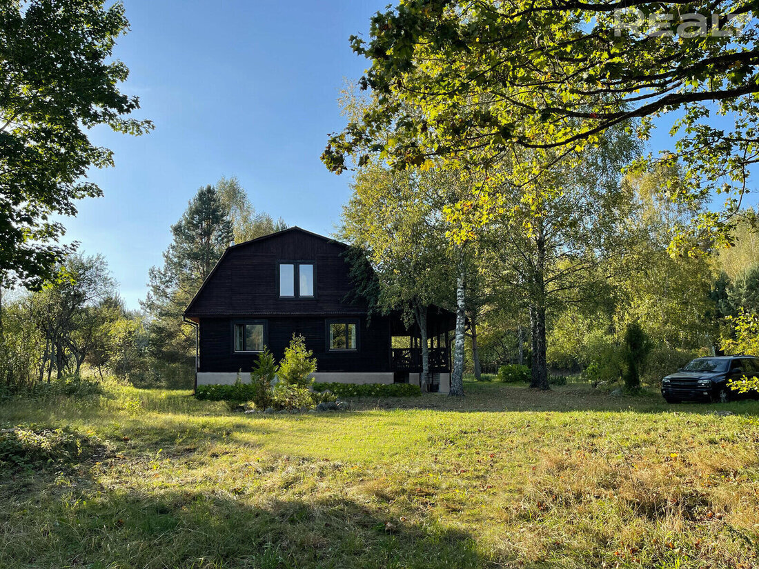 Этот дом с террасой находится в деревне на 10 хат в сосновом лесу на берегу реки Илья. И это идеальное место для отдыха в окружении природы. Строение довольно большое, в два этажа, на 200 квадратов. Уровень комфорта максимальный – есть теплый санузел с окном на сосны и ванной, современное отопление. Рассказываем подробнее об этом объекте и прицениваемся. Деревню Соколы без навигатора найти практически нереально – она надежно спрятана в сосновых лесах Вилейского края, дорога сюда грунтовая. Ближайшие магазины в поселках Партизанском и Илье (около 6 км). Вилейское водохранилище находится в 10 километрах. В 700 метрах – остановка автобусов в Вилейку, Минск и Красное. Жилых домов здесь всего 10, многие принадлежат минчанам. На продажу здесь только один и стоит он особняком от остальных, считай, хутор. Дом деревянный, на высоком фундаменте, с жилым вторым этажом (без чистовой отделки). Снаружи к нему примыкает просторная крытая терраса. Построен он в 2015 году. Фасад покрыт темной пропиткой