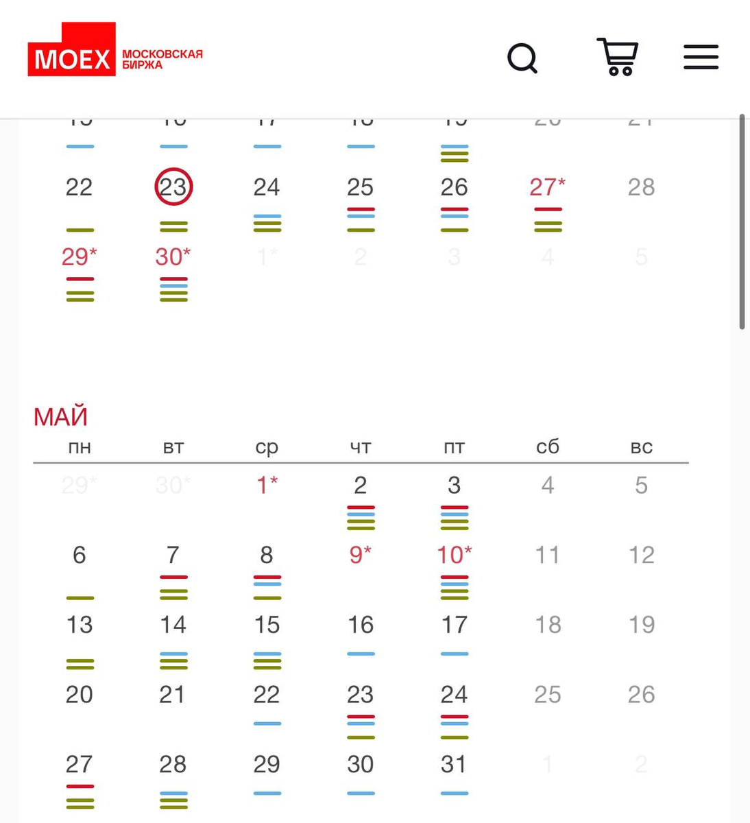 ГРАФИК РАБОТЫ МОСКОВСКОЙ БИРЖИ делится на 3 сессии: -Утренняя: с 7:00 до 10:00 (после событий февраля месяца утренняя сессия временно не проводится) -Основная (дневная): с 10:00 до 18:50 -Вечерняя: с 19:05 до 23:50 Как вы видите, биржа работает достаточно широкий диапазон времени. Но не обязательно сидеть за графиками от открытия до закрытия. Я не сижу за графиками весь день. Самые интересные часы для торговли сейчас с 10:00 до 18:00. В это время я совершаю позиционные сделки внутри дня. Что это значит? Я могу войти в сделку часов в 10-11 и тянуть ее несколько часов, пока цена не достигнет моей цели. Могу торговать более активно, если волатильность высокая - совершить за весь день от 4 до 6 сделок. Московская биржа определила регламент работы срочного рынка в период майских праздников 2024 года. Важная информация для всех трейдеров: ❌ 9 мая на Московской бирже неторговый день сколько часов в день занимает торговля у вас? Делитесь в комментариях.