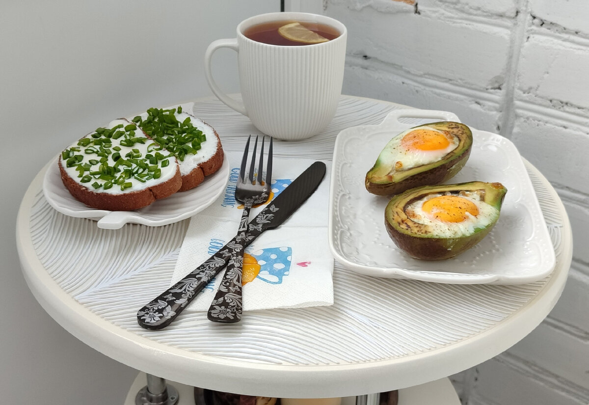 Авокадо с яйцом, запечённое в духовке, тосты с чесноком, сырами и зеленым луком, чай с лимоном и сахзамом.
