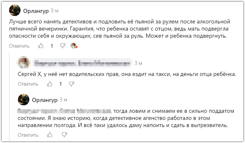 Мужчины убеждены: мать сидит и периодически науськивает детей с понедельника по пятницу, о том, какой плохой папка. Чтобы в субботу, когда папка позвонит или приедет, ребёнок отвернулся или отказался с ним разговаривать по телефону, или не захотел есть мороженое в парке аттракционов.