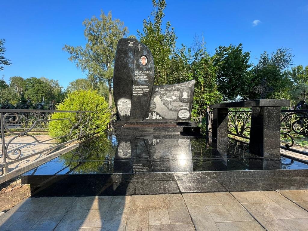 Комплекс выполнен из Хакосельского, добывается в Карелии. Основным элементом этого памятника является необычная форма и гравировка, которая размещена в центре стелы, все то, что так любила Татьяна Дубровская в жизни.
