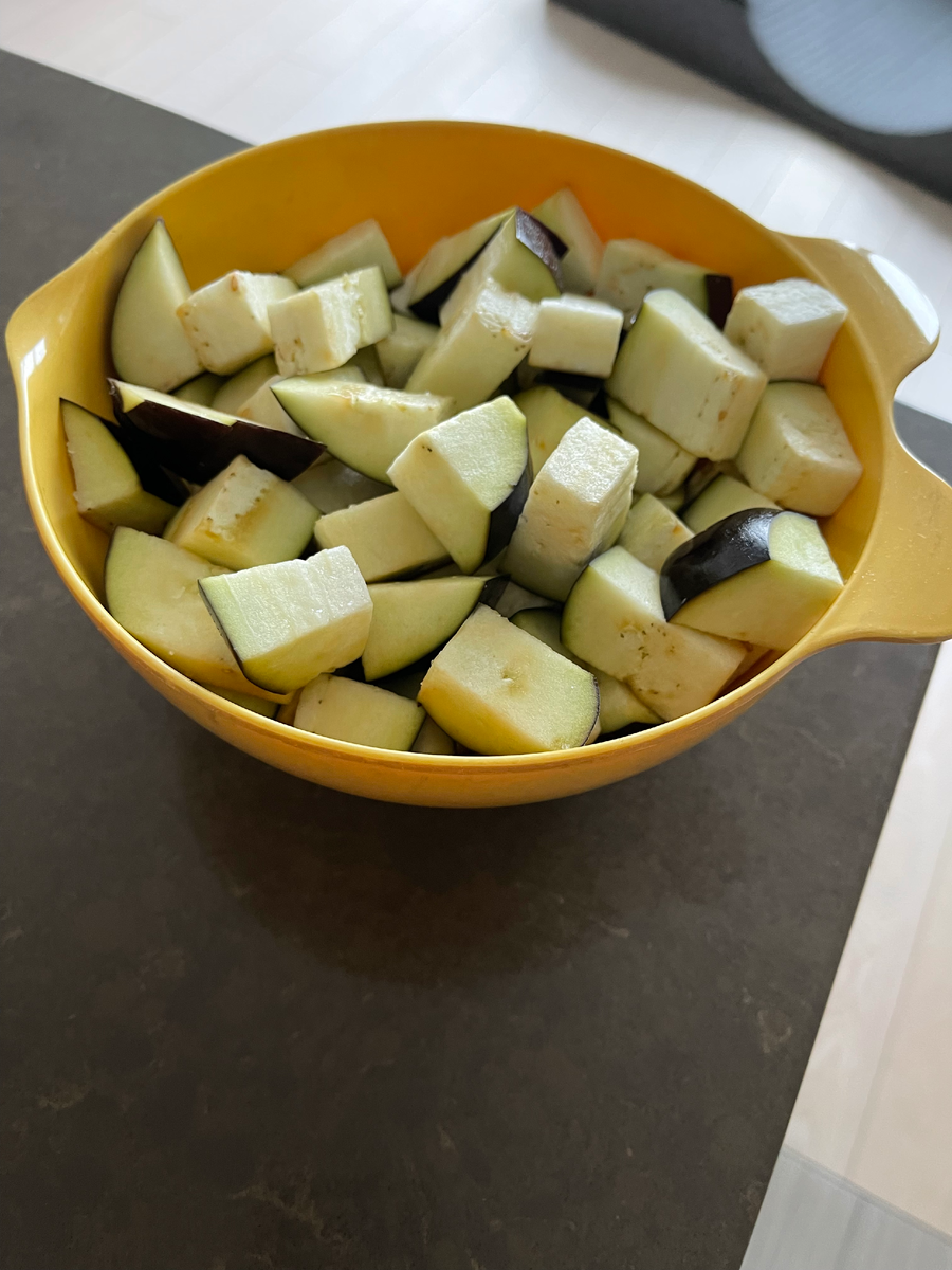 Всем привет! Сегодня я решила приготовить салатик и хочу поделиться рецептом с вами. Я взяла два баклажана, помыла и нарезала на большие кусочки. Потом я взяла три маленьких помидора и тоже порезала на большие кусочки. Взяла укроп, петрушку, рукколу и мелко порезала. Помидоры я положила пока отдельно от баклажанов и к помидорам добавила зелень. Потом я переложила баклажаны в небольшой пакетик и добавила немного муки и масла. И все хорошо потресла, чтобы все баклажаны были в муке. Уже в разогретую до 180 градусов духовку я ставлю баклажаны минут на 15. Вот такие красивые баклажаны у нас должны получиться. Перекладываю их в основную миску к помидорам. Затем беру брынзу и нарезаю на квадратики и тоже перекладываю в салатник. Также можно немного добавить кунжута. Вот такой красивый салат у нас получился. Всем приятного аппетита !