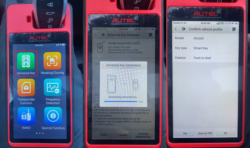 Я работаю над Honda Accord 2018 года выпуска, это автомобиль, запускаемый нажатием, и все ключи потеряны. Далее я собираюсь использовать Autel MaxiIM KM100 , чтобы запрограммировать для него новый универсальный ключ. Шаг 1. Создать ключ Вставьте универсальный ключ Autel в катушку KM100. Универсальный ключ >> Северная Америка, Honda, Accord, 2020 >> Создать универсальный ключ Генерация ключей прошла успешно. Шаг 2. Программный ключ ИММО >> Нажмите для запуска >> Да >> Блок управления >> Система бесключевого доступа (Honda) Зажигание включается двойным нажатием кнопки Старт? Нет Нажмите и удерживайте кнопку «Пуск». Зажигание включено, отпустите переключатель запуска/остановки двигателя. Нажмите «Все ключи потеряны». Условия регистрации Autel KM100E 1. Кодов неисправности нет. 2. Здесь должны быть все бесключевые пульты, которые хотят зарегистрироваться. В автомобиле должен находиться один пульт дистанционного управления без ключа. Примечания при регистрации. Обязательно выполните следу