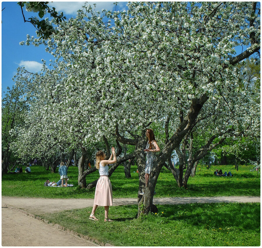 В шести коломенских садах при царе росли тысячи яблонь, сотни груш, белая, красная и черная вишни, кусты малины, смородины, крыжовника… Сейчас, конечно, всё скромнее, но оценить былые масштабы можно. Сказать, что в Вознесенском саду было людно — не сказать ничего! Скажем так — цветущую яблоньку, свободную от пьюще-жующих компаний, селферов и профессиональных фотографов со светом и костюмами, надо было ещё поискать!!