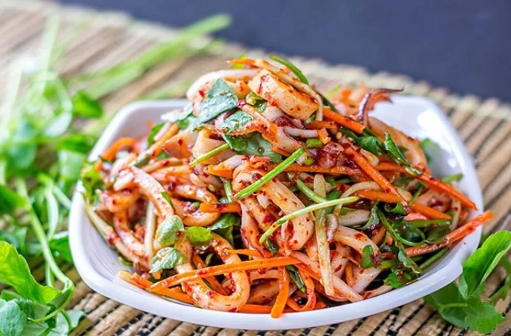 Очень яркий и необычайно вкусный салат с кальмарами и овощами – это пикантное блюдо. Оно уместно и на обычных ужинах, и на праздниках. В составе блюда нет ингредиентов животного происхождения, так что он понравится как веганам, так и постящимся. Ингредиенты: • кольца кальмара (замороженные) – 1 упаковка; • свежий огурец – 1 крупный; • масло (кунжутное) – 1 столовая ложка; • морковка по-корейски – 200 грамм; • черри – 1 упаковка; • зеленый лук – несколько перьев. Поэтапное приготовление салата: • Разморозьте кольца кальмаров естественным путем. Наберите в емкость воды, добавьте соль и выложите в нее продукт. Когда содержимое закипит, варите кальмары в течение минуты. Их оттенок должен напоминать вареный белок яйца. После приготовления остудите морепродукты. • На терке натрите огурец так, чтобы получить аккуратную соломку. Однако пользоваться нужно только той частью, где нет семян. В противном случае в салате будет чересчур много воды. • Небольшие помидоры нарежьте четвертинками. • В мис