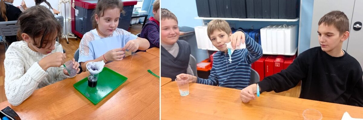 Для научных исследований и в промышленности, в основном, требуются чистые вещества. Некоторые примеси, даже в незначительных количествах, способны сильно поменять свойства веществ. При этом ребята выяснили, что примеси, т.е. компоненты смесей, сохраняют индивидуальные свойства. Именно этот признак используется для очистки или разделения смесей. Ребята для расширения своих знаний отправились в химическую лабораторию ВУЗа-партнера - Института биологии и химии МПГУ. На практическом занятии учащиеся смогли не только увидеть способы, с помощью которых можно разделить смеси (декантация, центрифугирование, хроматография, фильтрование и разделение с помощью делительной воронки), но и попробовать выполнить их самостоятельно.
