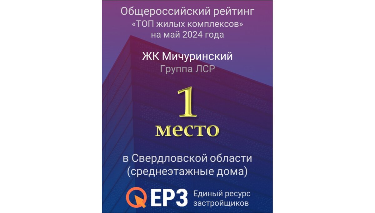 Среднеэтажный жилой комплекс «Мичуринский» крайне востребован среди покупателей на первичном рынке жилой недвижимости. Об этом свидетельствуют результаты общероссийского рейтинга «Топ жилых комплексов» на май 2024 года. Так, «Мичуринский» на Широкой речке в очередной раз стал лучшим среднеэтажным кварталом в Свердловской области. Исследование проводилось авторитетным порталом про строительство и недвижимость ЕРЗ.РФ.