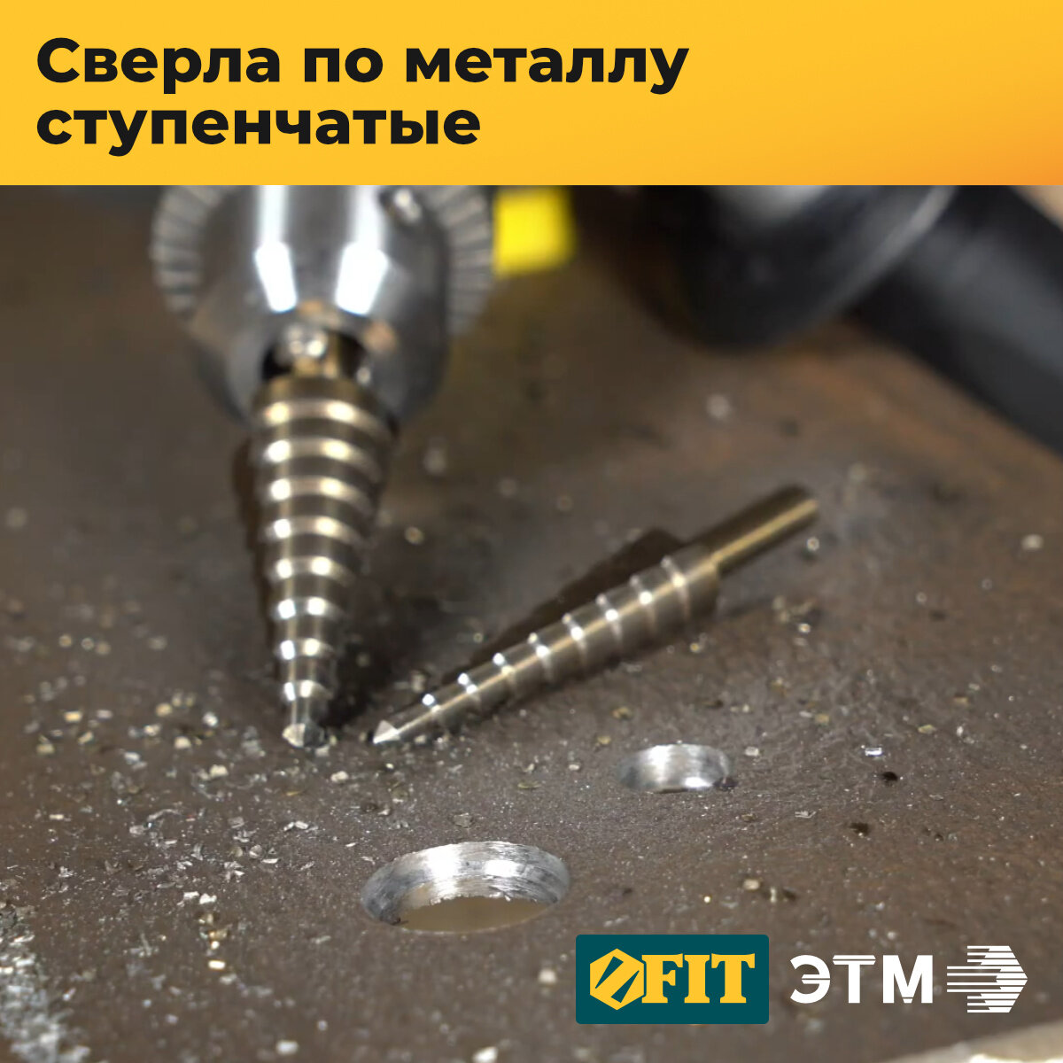 Ступенчатые сверла по металлу предназначены для сверления и рассверливания отверстий в листовых металлах (сталь, цветные металлы) и пластике. Сверла имеют ступенчатую коническую головку с острыми гранями на каждой ступени и хвостовик с круглым, трехгранным или шестигранным сечением. Форма сверла позволяет осуществлять сверление отверстий разных диаметров без необходимости менять оснастку. Такой подход существенно сокращает время обработки листовых металлов и повышает точность сверления. Ступенчатые сверла по металлу отличаются размерами, количеством и шагом ступеней, количеством рабочих канавок и их формой, материалами изготовления. Чаще всего ступенчатые сверла изготавливают из быстрорежущей стали. Для увеличения термостойкости сталь легируют 5% кобальта. Форма продольных канавок может быть прямой или спиральной. Сверла с прямой канавкой легко затачиваются, а спиральная канавка обеспечивает плавность хода сверла и способствует лучшему отводу стружки из зоны сверления. В каталоге ЭТМ в