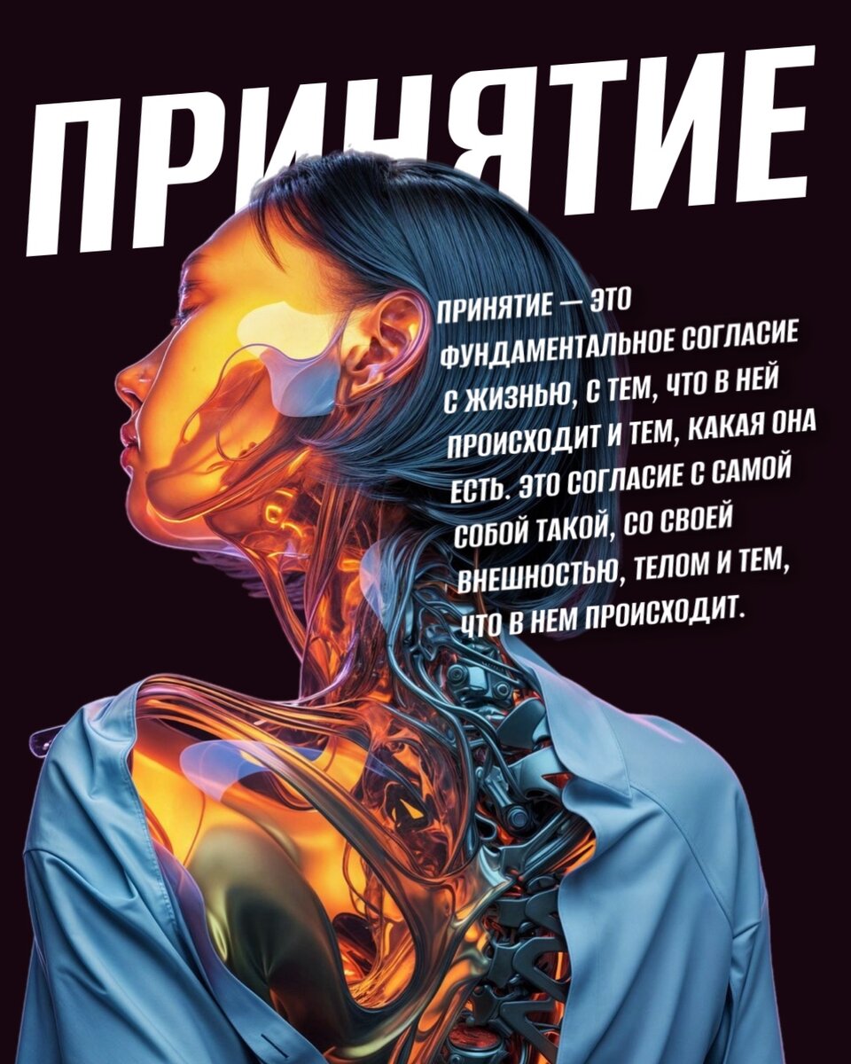 То, что должно быть сейчас для разрешения внутренних противоречий и противостояния с собой. Принятие — это согласие, это не отталкивать и не отрицать все то, как оно есть. Ни жизнь ни себя Не рассказывать себе сказки и не жить каждый день в иллюзиях о том, что тут должны быть холлы замков Монако, а я, вообще-то ощущаю себя дворянских кровей. Ты — это то, что однозначно у тебя есть сейчас. Такая какая есть, за это надо стать благодарной, как минимум. И вокруг есть "такая" жизнь. Всё уже прекрасно, милая! Фундаментально важно прийти к согласию с тем, что есть и какая ты, ведь демонстрация и проецирования вечного недовольства только ухудшат ситуацию, ведь проекция притянет проекцию. Может стать еще хуже и больнее — жизнь заставит оценить простое, когда не болело. О том, что вокруг что-то происходит я вообще молчу. Это не нашего ума дела. Это жизнь происходит, это происходит с нами, но нас не касается, мы этого не можем контролировать. Важно насколько мы ровны, спокойны, как мы восприним