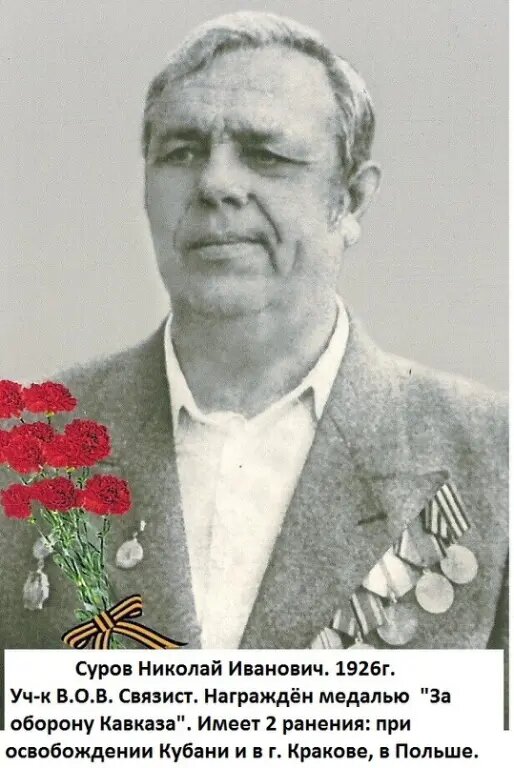 Николай Иванович освобождал Кубань, защищал Малую Землю. Был ранен при освобождении Кубани, лечился в госпитале в Гулькевичах. И опять на фронт. Гнали фашистов до самого Берлина. В 1945 году, перед самой Победой, в Кракове, Николай Суров был тяжело ранен. Лечился в госпитале, а домой вернулся в августе Победного года.
