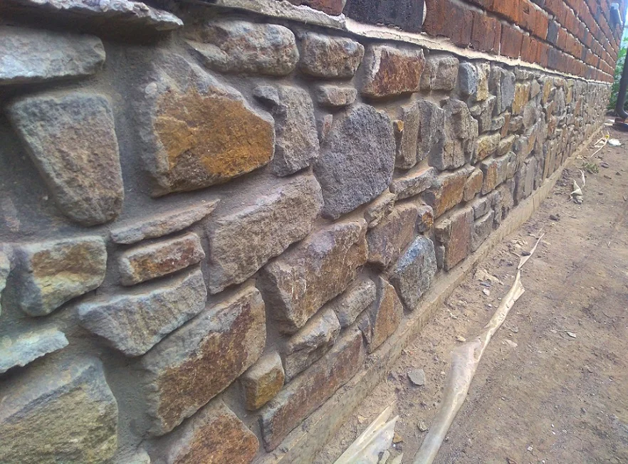 Первым моим объектом сталь цоколь — клал я камень впервые, поэтому работы заняли достаточно много времени. Потратил я на цоколь около двух недель, зато дальше всё было проще, так как за две недели я набрался достаточно опыта в подборе, подгонке и обработке камня.