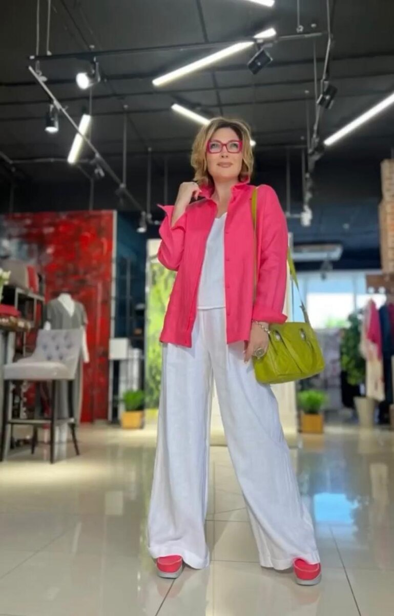 На фото ниже легкие, белые, воздушные брючки расклешенного силуэта. Надеваем белую майку, дальше рубашку из льна в размытом розовом цвете и комплект готов.