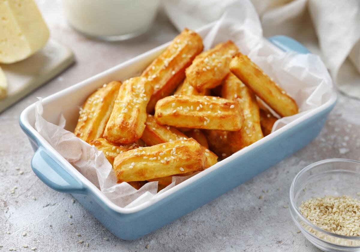 Подошел к концу последний рабочий день короткой предпраздничной недели мая и настала пора подумать, чем побаловать себя утром выходного дня, когда погода совершенно не спешит радовать теплом. Предлагаем испечь сырные печенья. Ингредиенты: Молоко — 250 мл. Масло сливочное — 80 г. Мука — 120 г. Яйцо куриное — 3 шт. Сыр полутвердый — 120 г. Кунжут — 1 чайная ложка Соль — щепотка Процесс приготовления: Разогрейте духовку до 200 градусов. В сотейнике соединить сливочное масло и молоко, довести смесь до кипения. В кипящую молочно-масляную смесь добавить щепотку соли и муку. Постоянно помешивая, заварить тесто до тех пор, пока оно не схватится в комок и не начнет отставать от стенок сотейника. Дать тесту немного остыть. Затем вбивать по одному яйцу, каждый раз доводя смесь до однородности. Сыр натереть на мелкой терке и добавить в тесто. Отсадить палочки на противень, с помощью кондитерского мешка. Посыпать кунжутом. Выпекать 20–25 минут. Рецепт и фото: свободные интернет-источники