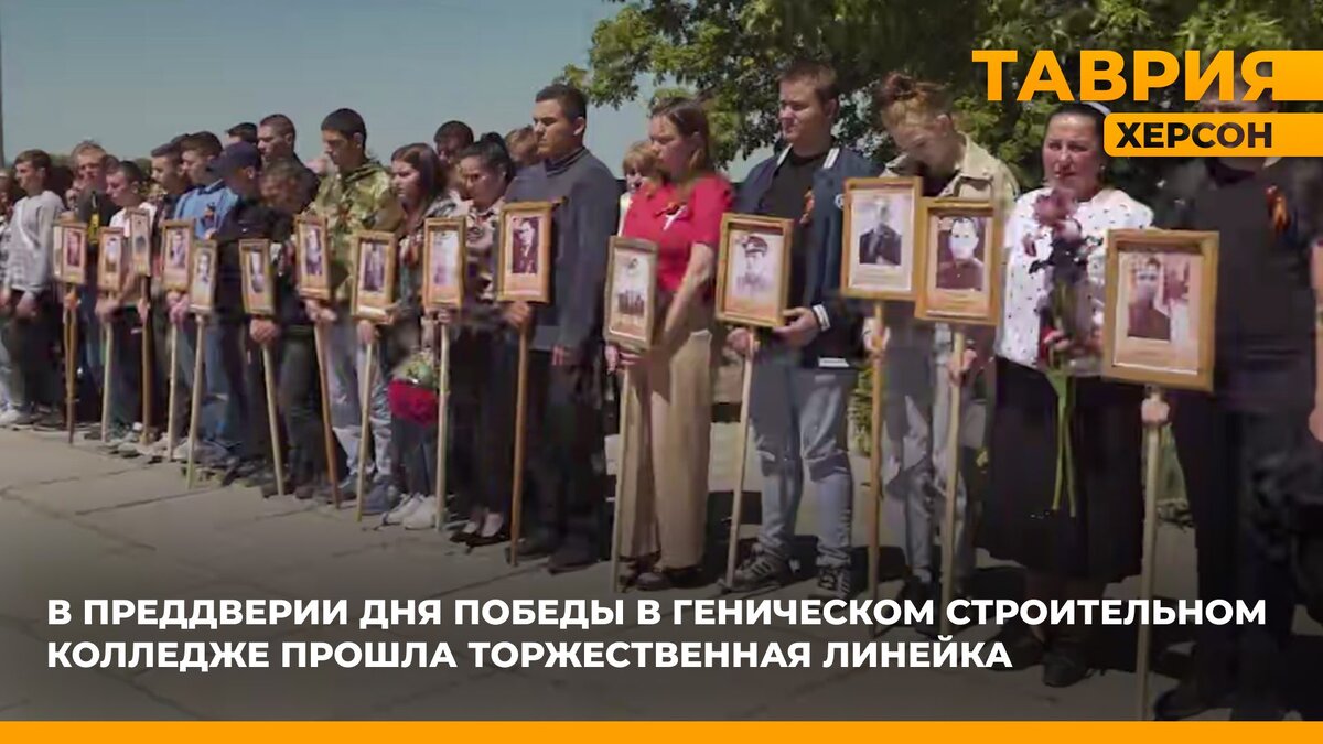 В преддверии Дня Победы в Геническом строительном колледже состоялась торжественная линейка. На мероприятии присутствовали почётные гости, в том числе ребёнок войны Виктор Колбасенко. После линейки гости и студенты приняли участие в акции «Бессмертный полк», они прошлись с портретами своих героев и возложили цветы к мемориалу. Его на территории колледжа создали в прошлом году. К акции присоединился депутат Херсонской областной думы Энвер Абдураимов. «Я пришёл со своим родным дедушкой. Он 1912 года рождения. К моей радости, к моему удивлению он прошёл всю войну. Был мобилизован за год до начала войны и в 45 дошёл до Берлина», – рассказал Энвер Абдураимов. Депутат также передал колледжу знамя победы. Человеку, который был очевидцем тех страшных событий, он вручил цветы и подарок. В завершение встречи все участники собрались за чаепитием. Студенты имели возможность пообщаться с Виктором Колбасенко, который поделился с ними своими воспоминаниями. Ранее акцию «Бессмертный полк» провели в ге