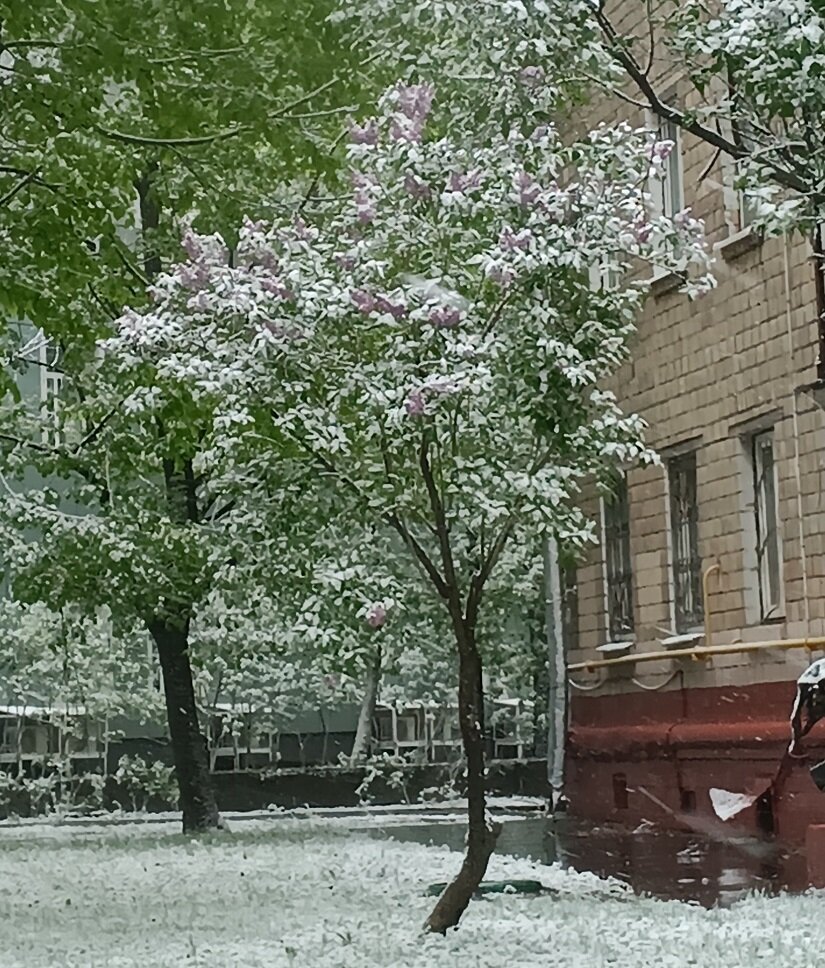 Этот май не перестаёт удивлять. Не знаю, как дела с моими цветочками на даче, а в городе всё только хуже становится. Такой снегопад налетел, ни земли, ни неба не видно было. Насыпал много снега, но земля, и особенно асфальт, тёплые ещё. Поэтому всё активно начало таять. Цветы засыпало, но ещё сопротивляются они непогоде. А бедные тюльпаны повалило, даже не столько снегом, сколько ветром, наверное. Никогда ещё на моей памяти цветущий молочай не видел снега) Асфальт уже оттаял, он теплее газонов и цветников был. А вы видели аистов в снегу? Только не пугайтесь, ни один аист не пострадал, они не настоящие))) Но смотрится прикольно) А вот сирень цветёт по-настоящему, тоже, наверное, удивляется, что это за беда с ней приключилась, что это такое на её голову прилетело) Вот такой он, наш московский май. Его сюрпризы ещё не закончились, потому что нынешней ночью обещают -6 градусов. Вот тут-то уже и тюльпанам, и сирени не поздоровится, и прочим цветам. Интересно, листья на деревьях выдержат так